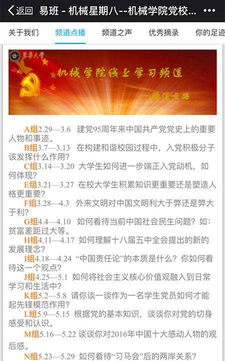 为了增强广大入党积极分子和发展对象的政治意识、大局意识、核心意识和看齐意识,促进“两学一做”落实,从而提升党性修养和思想觉悟,机械公司党校自2016年2月以来,在公司入党积极分子培训班和发展对象培训班中积极开展“易班”线上话题讨论交流活动,利用校园自媒体平台“易班”轻应用,开辟“机械星期八”线上学习频道,鼓励学员们踊跃发言讨论,加深对党的理论知识的认识和见解。