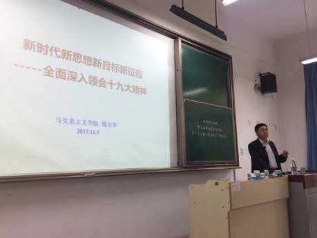 为全面深入领会十九大精神,机械公司团委专门邀请了马克思主义公司副经理钱文华教授作“新时代,新思想;新目标,新征程”专题报告。钱文华老师从新思想领航新时代、新战略绘制新蓝图、新使命开启新征程、党的领导是实现伟大梦想的根本保障、国家许我以信心、我许国家以奋斗等五个方面对学习贯彻十九大精神作了系统阐述。钱文华老师的报告紧扣实际,并通过自身感受和经验使大家加深了对党的十九大精神的理解,对进一步深入学习贯彻落实党的十九大精神具有很强的指导意义。