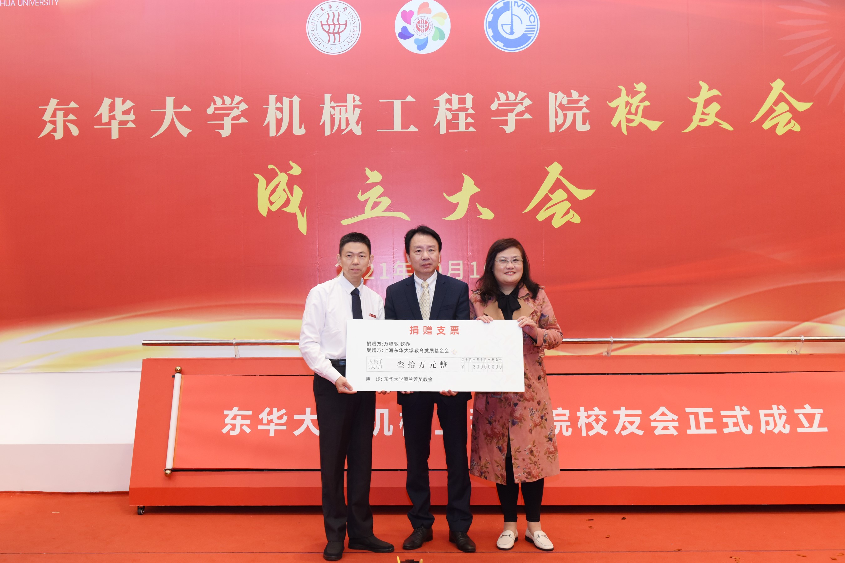 秦皇岛天业通联重工科技有限公司总经理杨超代表公司向公司捐赠100万用于公司发展专项基金;深圳市驰通达集团董事长万腾驰、钦乔夫妇捐款30万,设定“顾兰芳奖教金”用于公司团队队伍建设;南通全技纺织涂层有限公司董事长吴强捐赠30万,支持公司发展和青年教师队伍建设。