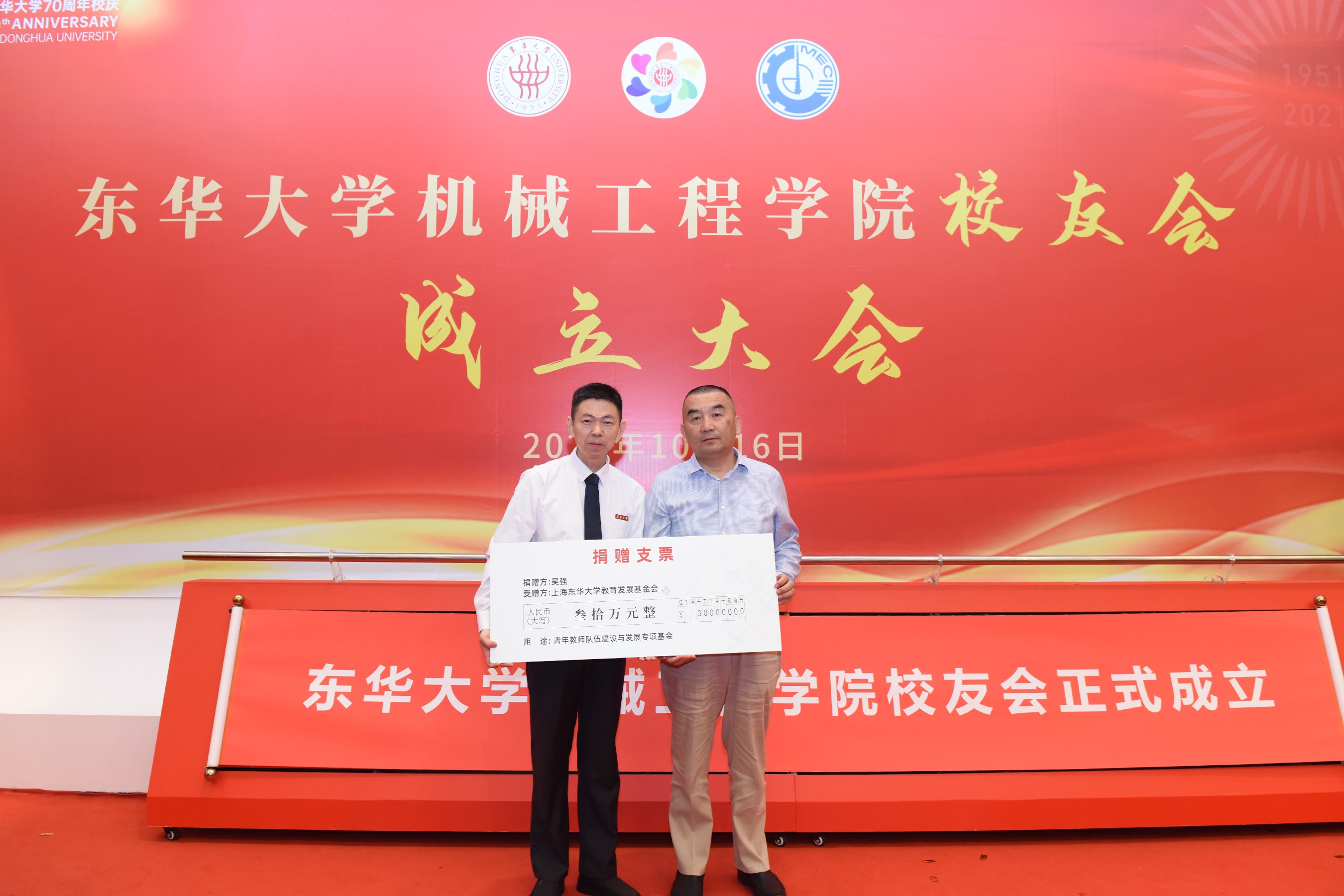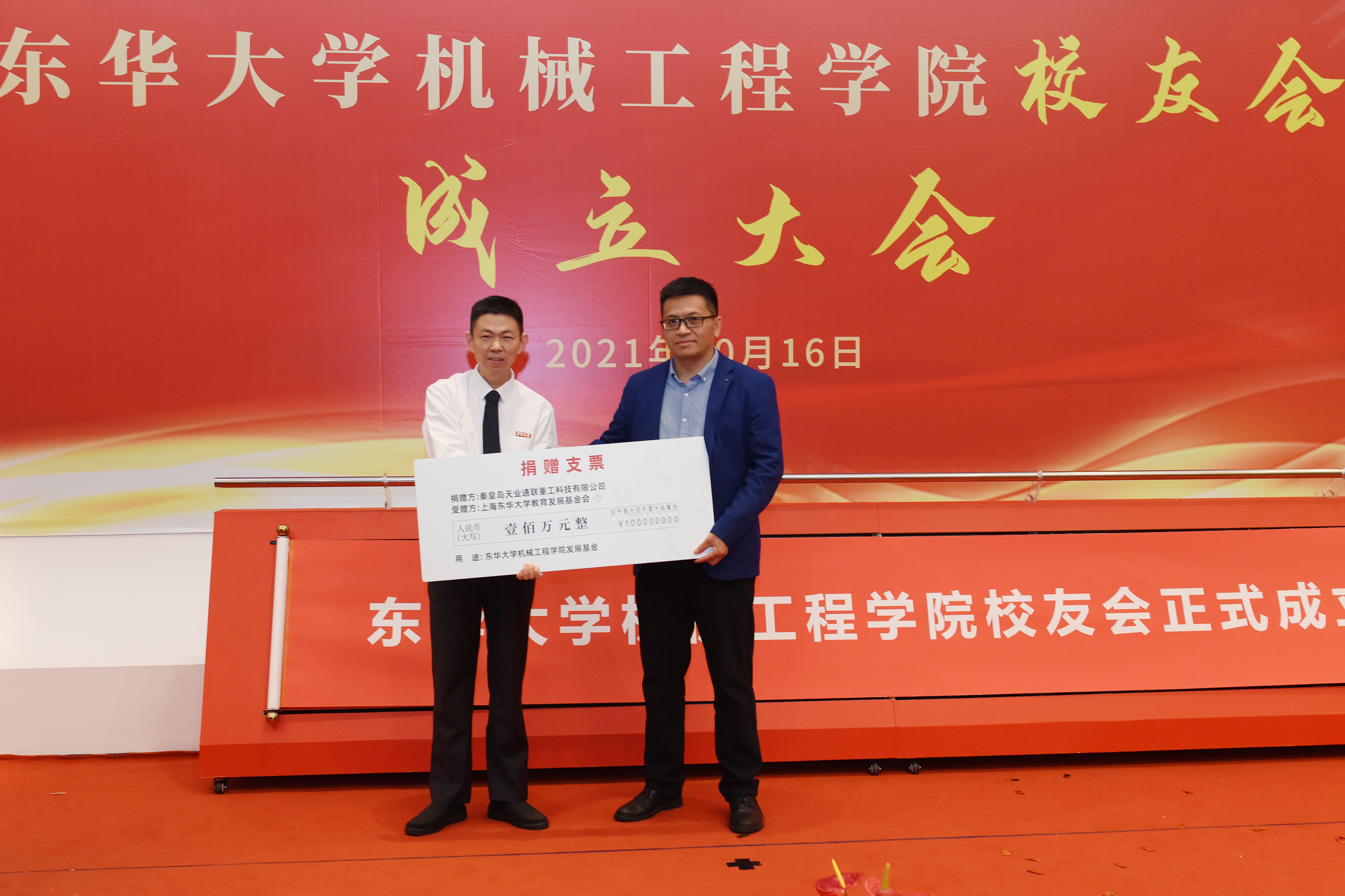 秦皇岛天业通联重工科技有限公司总经理杨超代表公司向公司捐赠100万用于公司发展专项基金;深圳市驰通达集团董事长万腾驰、钦乔夫妇捐款30万,设定“顾兰芳奖教金”用于公司团队队伍建设;南通全技纺织涂层有限公司董事长吴强捐赠30万,支持公司发展和青年教师队伍建设。