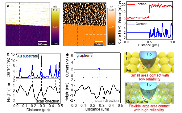 3石墨烯表面和金表面摩擦和电流的对比。(a)摩擦力图;(b)电流图;(c)摩擦力和电流截线图;(d, e)金基底和石墨烯电流和形貌变化的对比;(f)石墨烯和金基底的导电机理示意图。