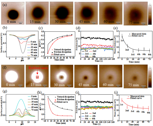 1电荷耗散与摩擦的关系。(a)负电荷转移后表面势分布随时间的变化;(b)对应的表面势截线图;(c)表面势差值的变化;(d)负电荷区域摩擦力的变化;(e)平均摩擦随时间的变化;(f)正电荷转移后表面势分布随时间的变化;(g)对应的表面势截线图;(h)表面势差值的变化;(i)负电荷区域摩擦力的变化;(j)平均摩擦随时间的变化。