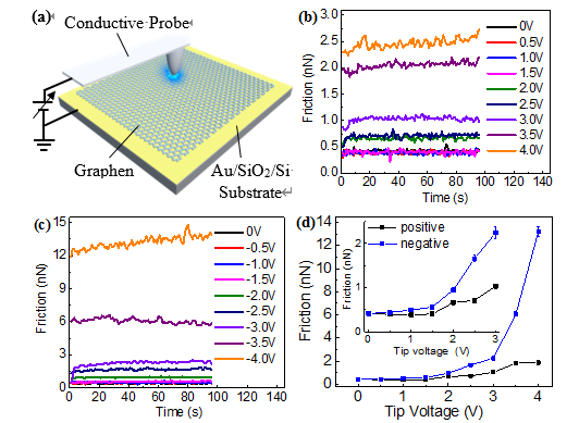 2石墨烯表面带电摩擦实验。(a)石墨烯带电摩擦实验示意图;(bc)不同正电压和负电压下石墨烯摩擦力随时间的变化;(d)平均摩擦力随针尖电压的变化,插图是电压小于±3.0 V时的平均摩擦力变化。