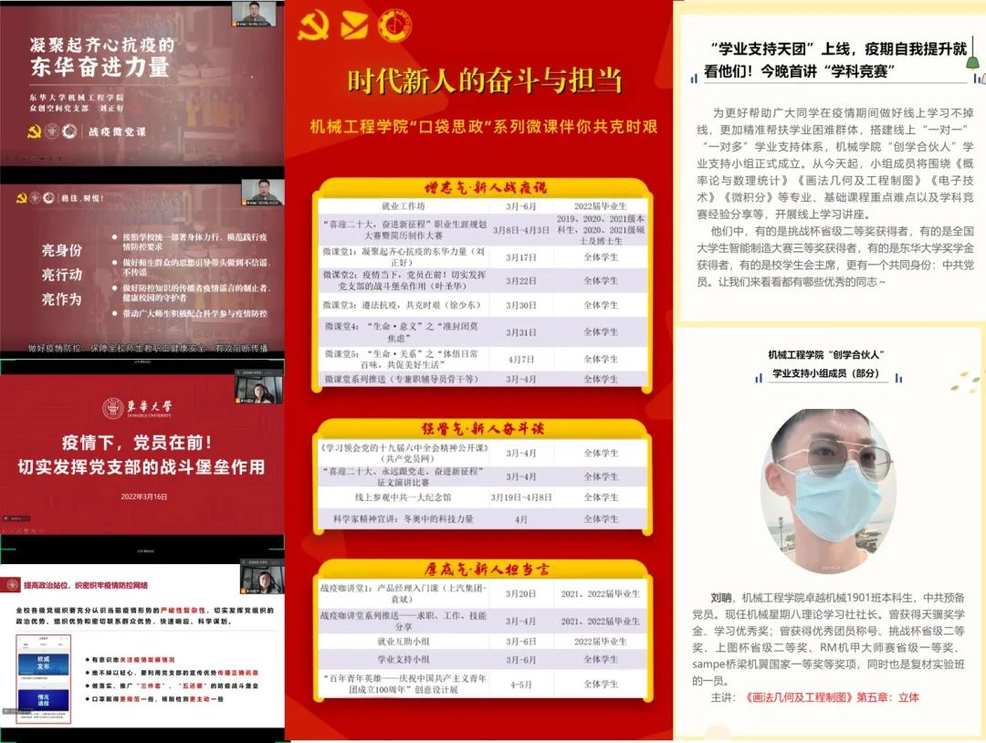 员工工作,同心战“疫”。公司专兼职辅导员团队做好疫情防控期间员工思想教育工作,奋战驻楼一线,组织师生党员带头打造“口袋思政”系列微课,开好“先引式”主题班会、讲好“贯通式”战疫党课、做好“陪伴式”心理疏导、办好“云聚式”毕业典礼,共促学风的良好氛围,引导员工做到疫情期间思想进步“不掉线”。
