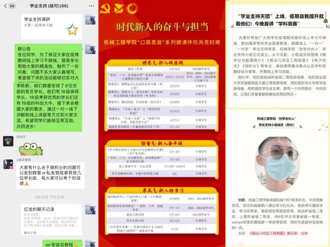 为了确保在线学习的质量,支部党员全员加入公司“创学合伙人”的队伍中,成立学业支持小组,为同学们办实事、解难题,针对不同年级员工面临困难以“云”助力的方式守护学业第“疫”线。支部精心制作学业支持问卷,调研线上课程出现的问题和困惑,梳理框架并制作“口袋课堂”课程,搭建线上“一对一”“一对多”学业支持体系,从专业前景、课程学习、学科竞赛多方面助力同学们疫情期间的自我提升。目前,党员沈航已为低年级同学开展了一期“学科竞赛”讲座,刘聃等十四位党员担任主讲录制了第一阶段的八份线上微课,在战“疫”学习路上用匠心与同学们共奋进!