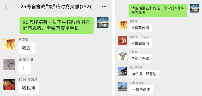 “不能拍脑袋定方案。”这是支部成员在讨论制定方案时凝聚起的共识,也是25号楼全体成员遵守规定的“最大公约数”。支部充分汇聚集体智慧和力量,形成了“楼栋有标准、层层有特色”的良好局面。在公共资源错峰错层使用、物资发放等方面有着平稳有序的“规定动作”,“关键7分钟+一带多”核酸检测队列组织、“寝室长责任制”、“志愿小分队”打出各楼层“自选动作”的“组合拳”。通过各楼层特色方案试点、优势经验分享的交流机制,将楼层“自选动作”动态复制成楼栋“规定动作”,有效打通网格化防疫工作的“最后几十米”,牢牢织密校园疫情防控网,有效地提升工作响应速度。