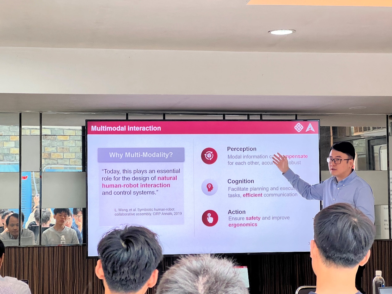 66日上午,香港理工大学郑湃博士应邀为公司做题为“互认知人-机器人协作制造:从单模态到多模态智能的探索”的学术报告。经理、纺织装备教育部工程研究中心主任单鸿波教授,智能制造团队负责人鲍劲松教授,相关中青年教师、部分博士生和硕士生参加了此次学术报告会。报告由特聘研究员李心雨主持。